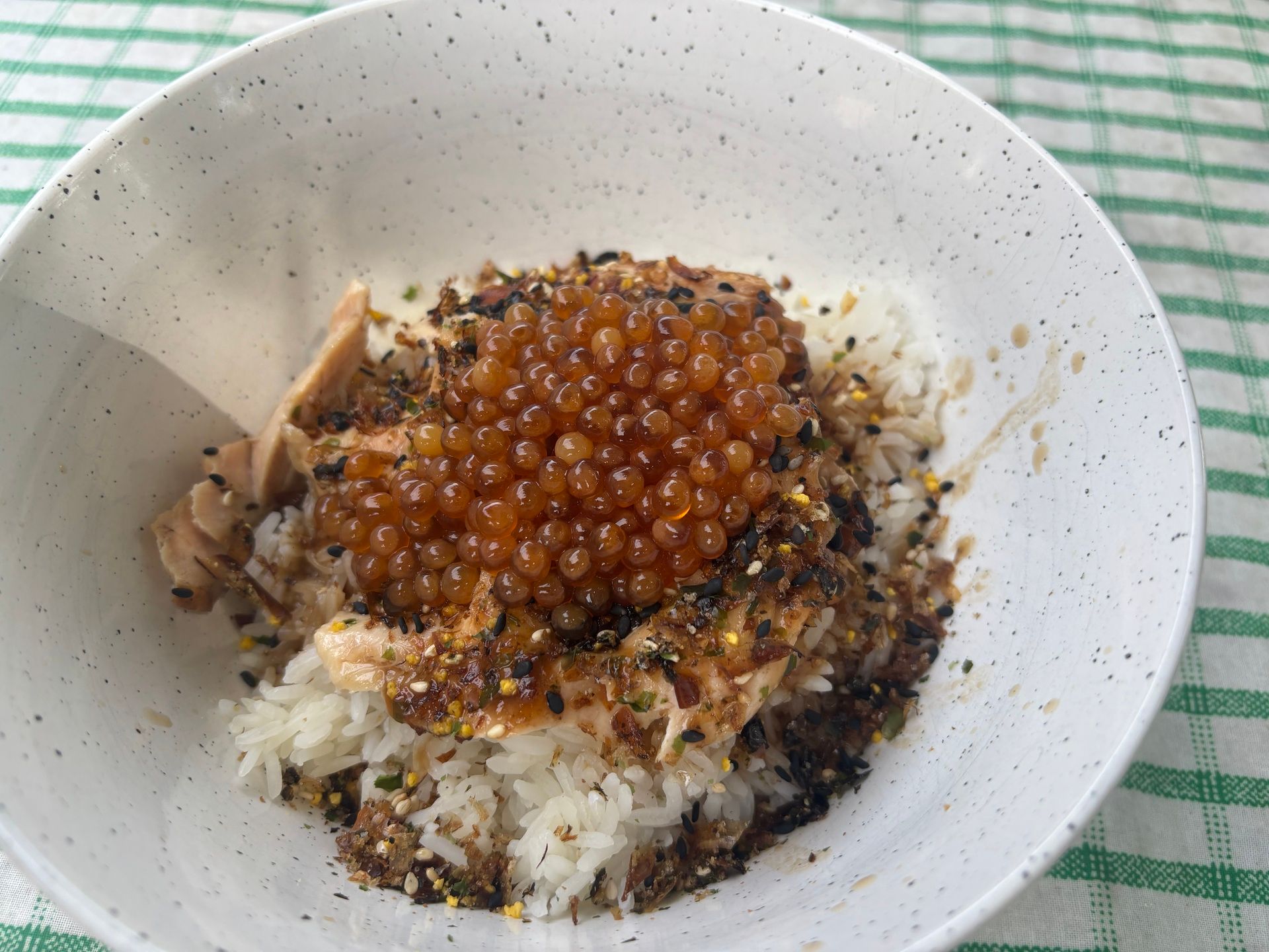 Leftover salmon bellies, rice, and homemade ikura (marinated salmon roe)