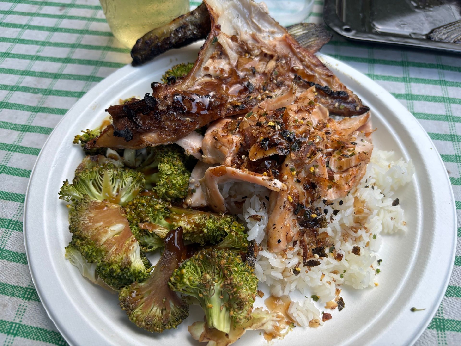 Salmon collars and bellies with rice and charred broccoli.